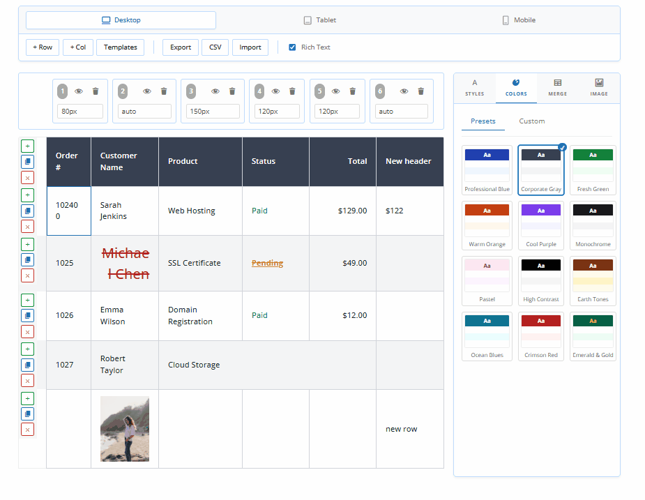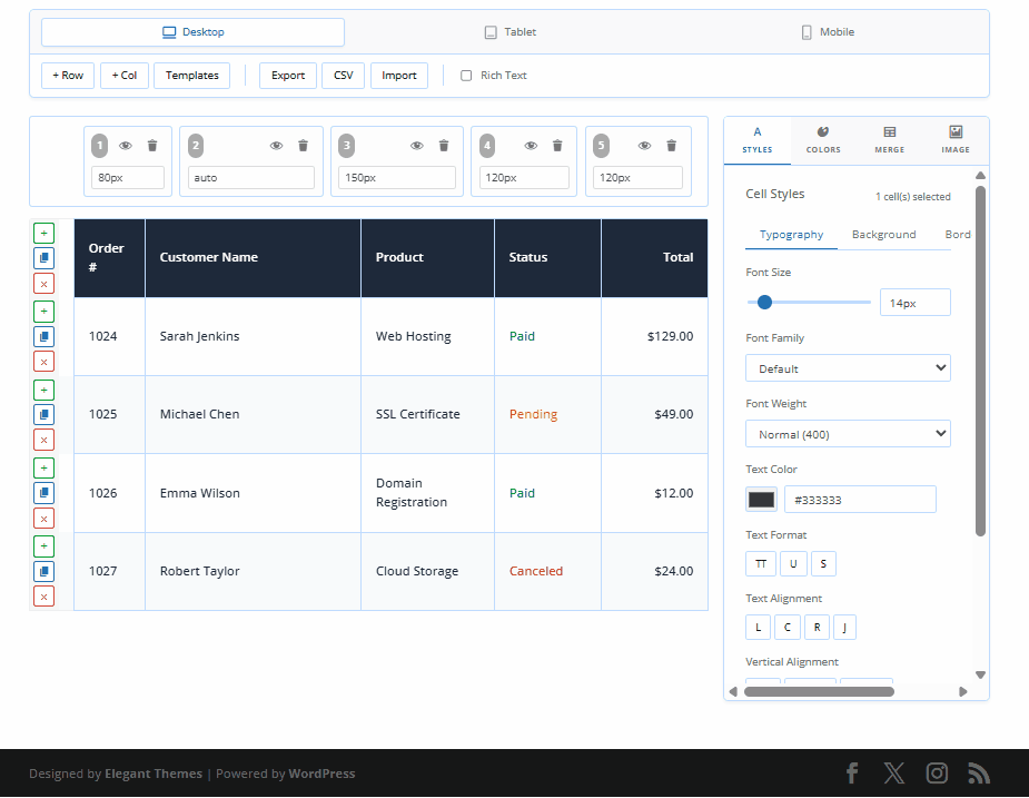 Take total control over your design with individual cell-level styling.Customize every detail, including typography (font family, weight, size), background colors, and borders, to match your brand's unique aesthetic.