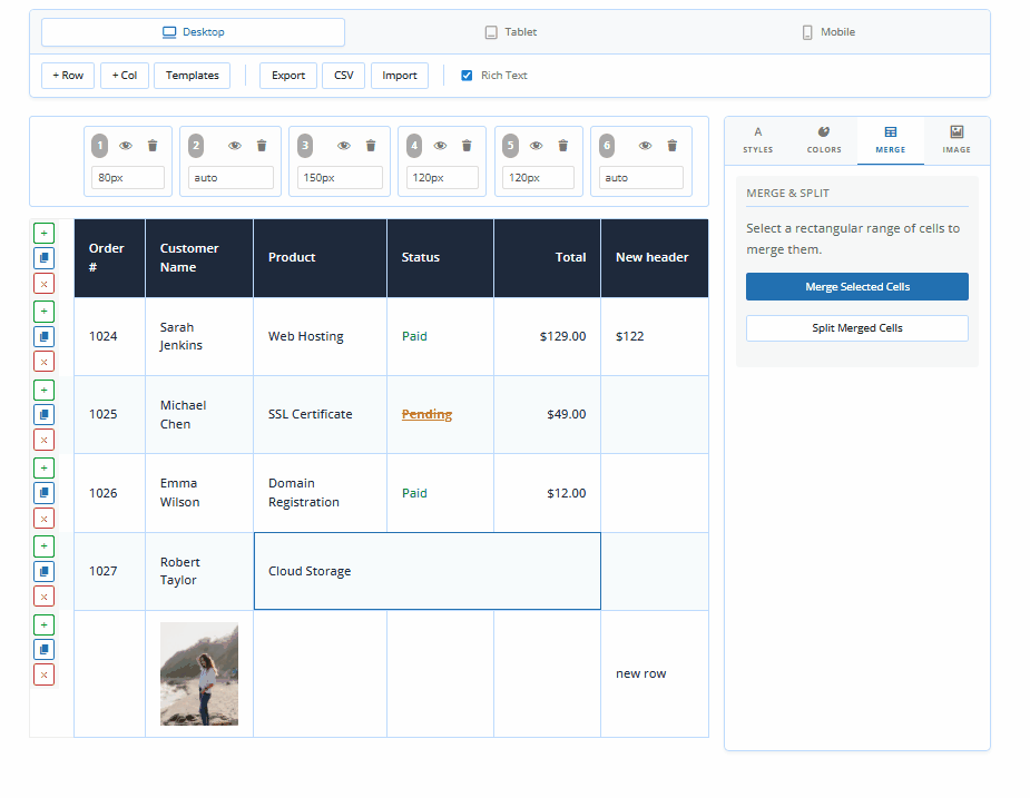 Manage your table structure with ease using an intuitive interface. Quickly add, delete, or duplicate rows with a single click; the plugin ensures all nested cell styles and content are perfectly preserved during duplication.